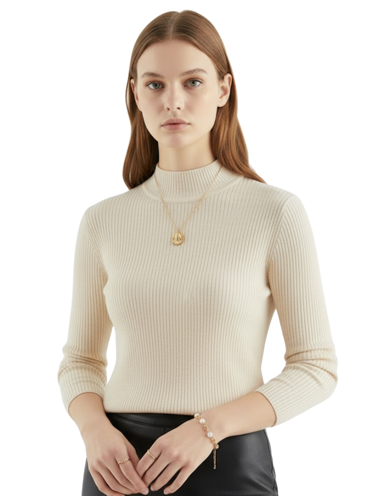 A timeless and sophisticated old money look featuring a cream ribbed knit sweater and white tailored trousers, exuding effortless elegance and refinement.