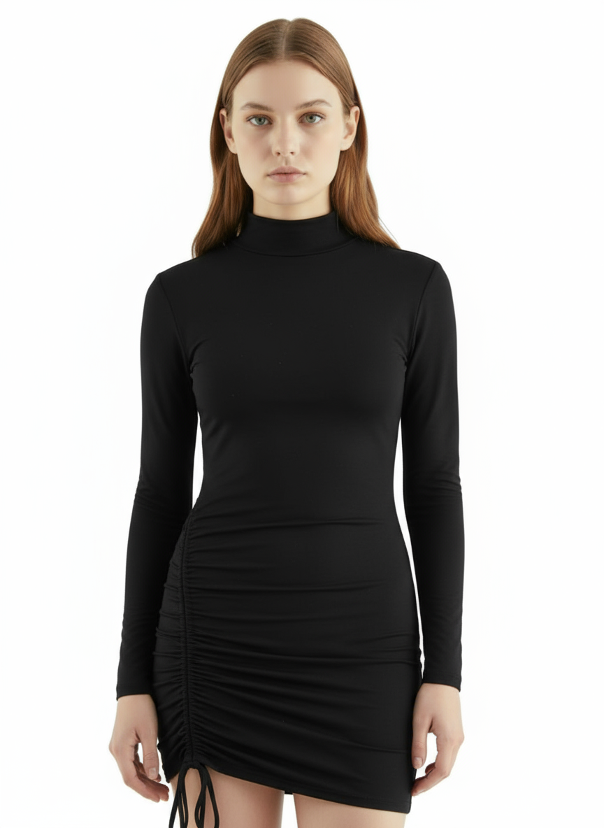 Crafted from high-quality stretch fabric, it hugs your figure perfectly, enhancing your curves in a natural and refined way. The turtleneck adds a classic touch, while the ruched details and body-hugging design create a look that is feminine, bold and irresistible.